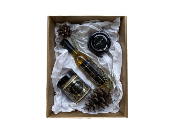Dovanų rinkinį puošnioje auksinėje dėžutėje su permatomu plastikiniu dangteliu sudaro :
