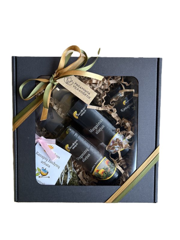 Dovanų rinkinį puošnioje juodo kartono dėžutėje su langeliu sudaro :