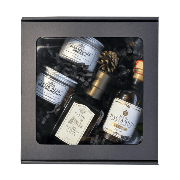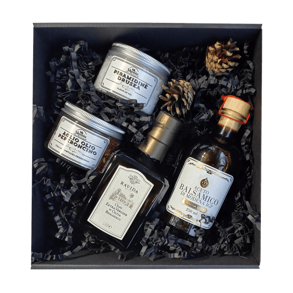 Dovanų rinkinys su RAVIDA aukščiausios klasės ekologišku aliejumi, MODENA balzaminiu actu bei įvairias prieskoniais.