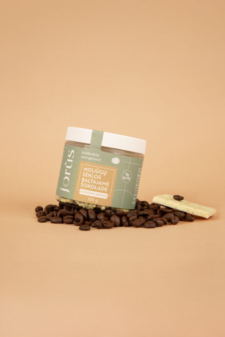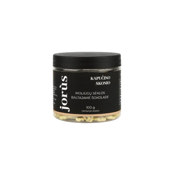 Sudedamosios dalys: 64 % baltasis šokoladas (cukrus, kakavos sviestas, pieno milteliai, išrūgų milteliai, emulsiklis: sojų lecitinas, vanilės ekstraktas), 33 % moliūgų sėklos, maltodekstrinas, kapučino kvapioji medžiaga, natūrali kvapioji medžiaga, glazūravimo medžiagos: arabiko guma, cukrus, medus.