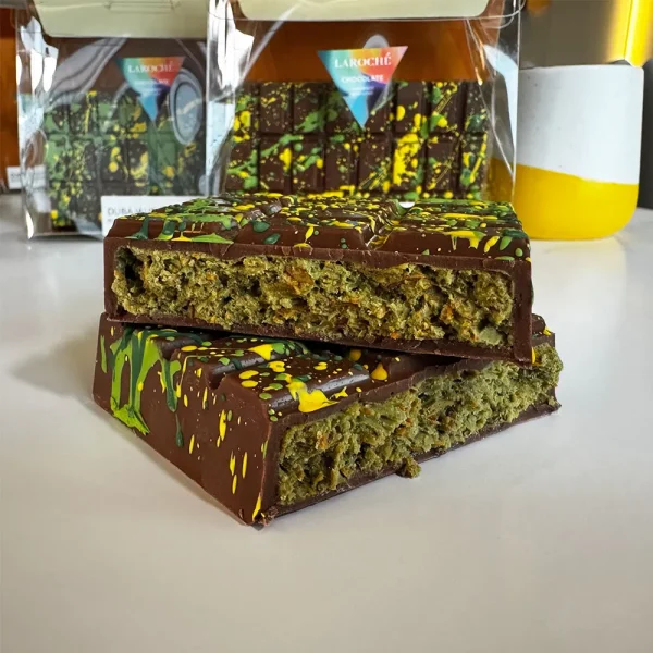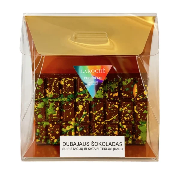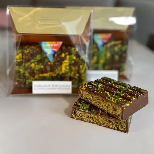 Visame pasaulyje išpopuliarėjęs „Dubajaus“ šokoladas – išskirtinis skanėstas, kurį kuria LAROCHÉ šokolado meistrai. Rankų darbo šokolado plytelė gaminama iš pieninio šokolado, praturtinta gausiu pistacijų pastos ir traškios, skrudintos kadayif tešlos įdaru.