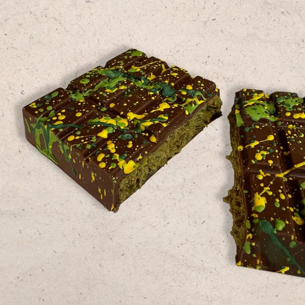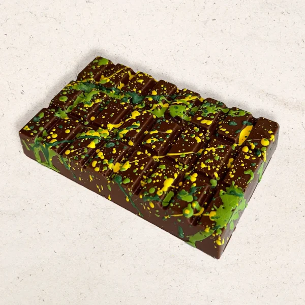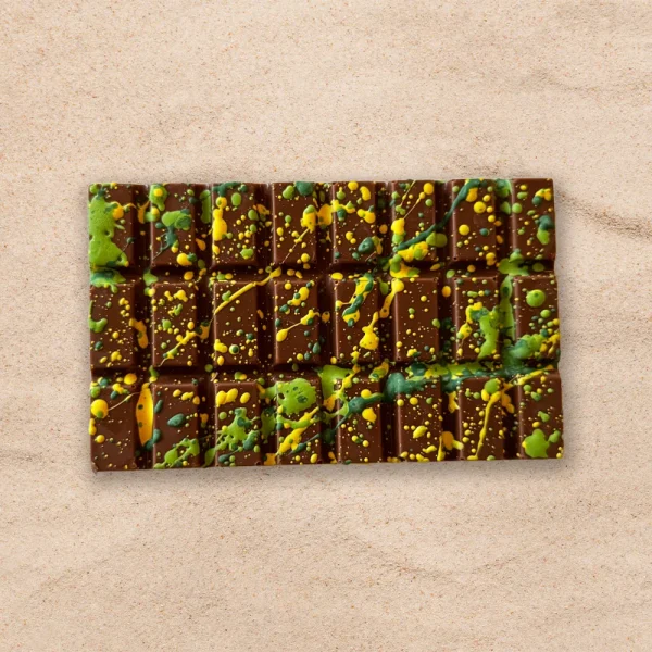 Kiekviena plytelė – unikali ir nepakartojama, puošta spalvotu kakavos sviestu. Plonas šokolado sluoksnis dengia ypatingai gausų traškaus įdaro kiekį, sukurdamas harmoningą skonio ir tekstūros derinį.