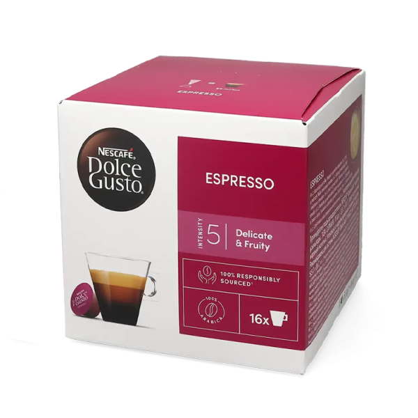 Atraskite intensyvų ir aromatingą NESCAFÉ® Dolce Gusto® Espresso. Tai klasikinė itališka kava su sodria kremine puta ir subalansuotu skoniu – idealus pasirinkimas mėgstantiems stiprią, bet elegantišką espresso.