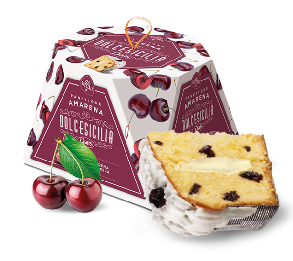 Panetone pyragas su laukinių vyšnių cukatomis bei plikytu kremu ir vanilės glaistu 800g. DOLCE SICILIA