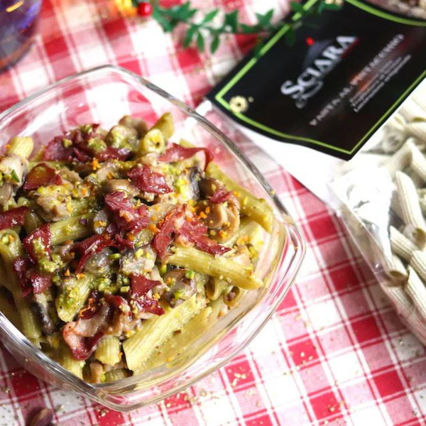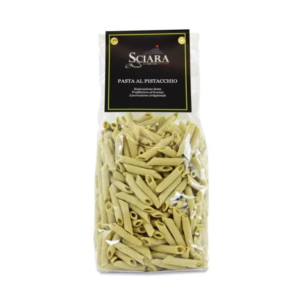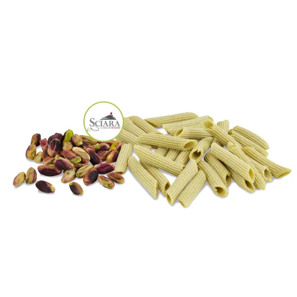 Sudedamosios dalys: Sicilietiški kietieji KVIEČIŲ miltai, PISTACIJOS (10 %), dažikliai: kurkuminas (E100), vario chlorofilinas (E141).