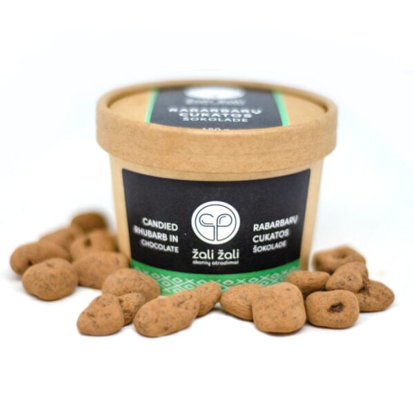Sudedamosios dalys: juodas šokoladas (kakavos masė, cukrus, kakavos sviestas, ne GMO sojų lecitinas), džiovinti rabarbarai (rabarbarai, cukrus), kakavos milteliai.