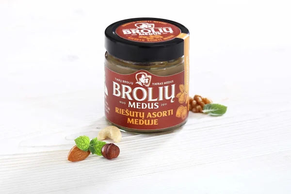 Sudedamosios dalys: medus 40 %, anakardžių riešutai 15 %, graikiški riešutai 15 %, lazdynų riešutai 15 %, migdolų riešutai 15 %.